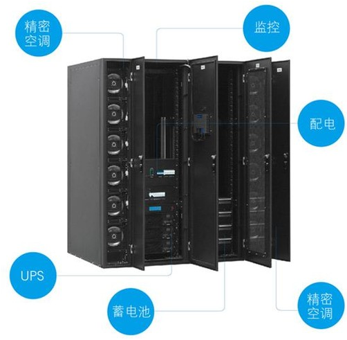●一體化集成小型模塊化數(shù)據(jù)中心,集成了IT主機(jī)柜(集成UPS、配電、監(jiān)控)、精密空調(diào)、蓄電池柜